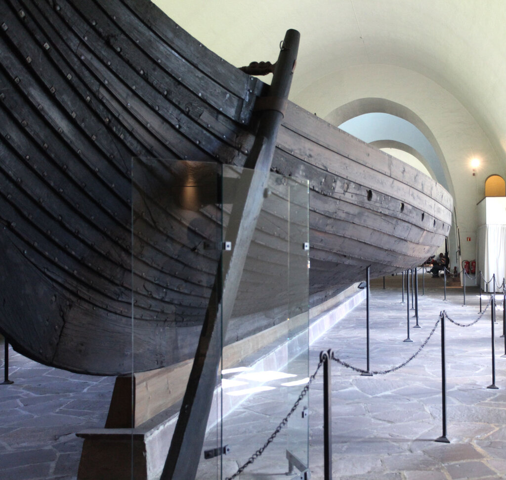 Le stern (pignon arrière) du navire Gokstad exposé dans un musée.